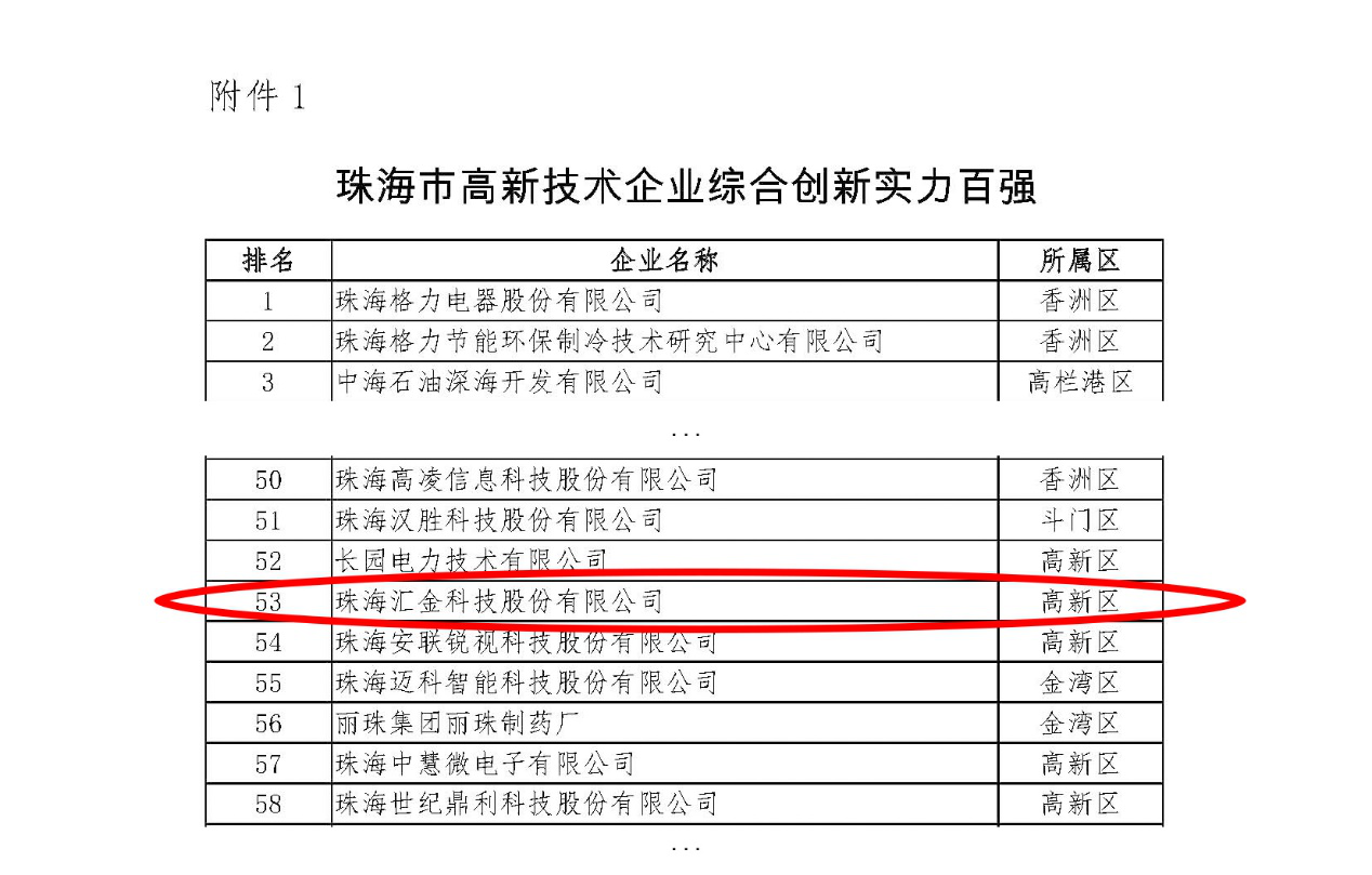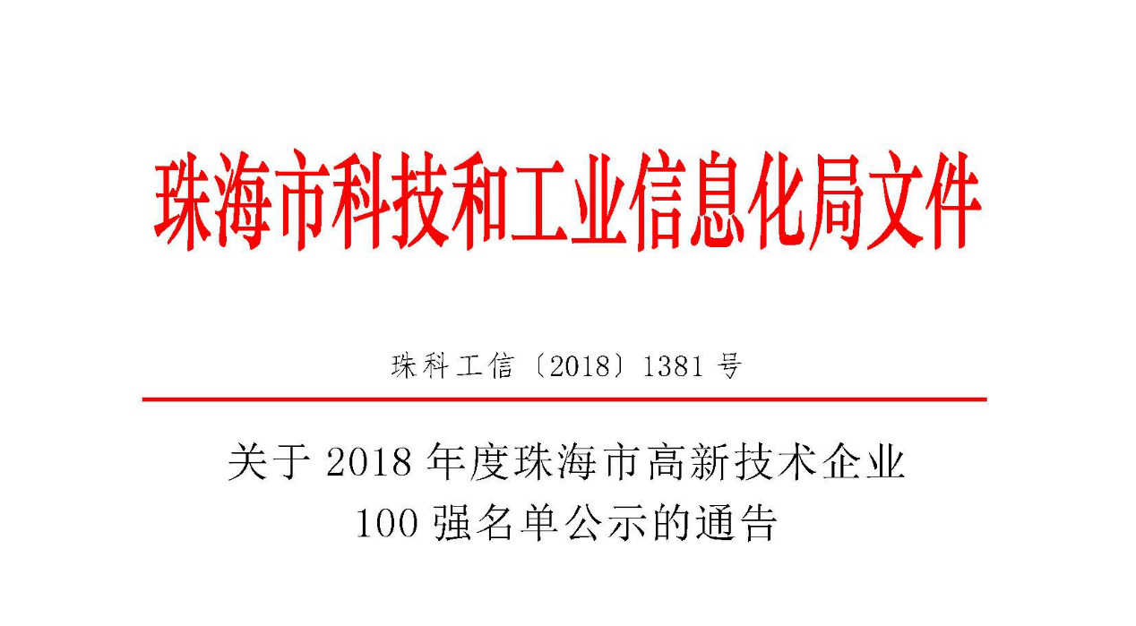 On October 26, according to the evaluation of Technology and Information Bureau of Zhuhai, Huijin Technology was listed among "2018 Top 100 Outstanding Enterprises of Zhuhai for Comprehensive Innovation Capacity and Tax Contribution".
