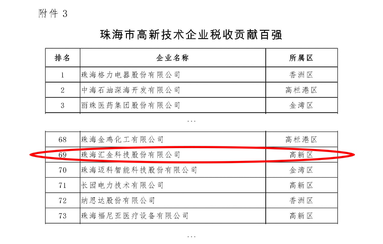 Celebrate Huijin Technology Being Listed Among Top 100 Outstanding Enterprises of Zhuhai for Comprehensive Innovation Capacity and Tax Contribution